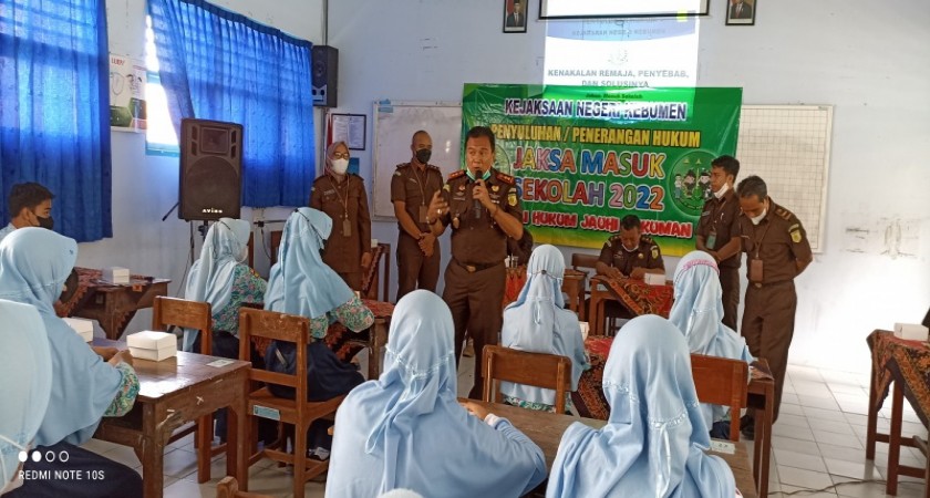 Kamis, 24 Februari 2022 Kejaksaan Negeri Kebumen mengadakan Kegiatan Jaksa Masuk Sekolah, di SMP Negeri 5 Kebumen. Kegiatan yang dihadiri lebih dari 50 peserta siswa SMP Negeri 5 Kebumen Negeri 5, berlangsung dengan lancar. Kegiatan ini dibuka oleh BapakDrs. Fajar Sulistiawan, S.H.,M.H sekaligus memberikan pengarah. Dilanjutkan materi mengenai bijak bersosial media dan pengenalan lembaga Kejaksaan Oleh Bapak TRimo, S.H.,M.H. Pada bagian Akhir kasi Intel Kejari Kebumen Bapak Faisal Sesario Arapenta, S.H memberikan game yang bernuasa wawasan kebangsan pada anak-anak SMP Negeri 5 Kebumen sekaligus memberikan plakat pada pihak sekolah.